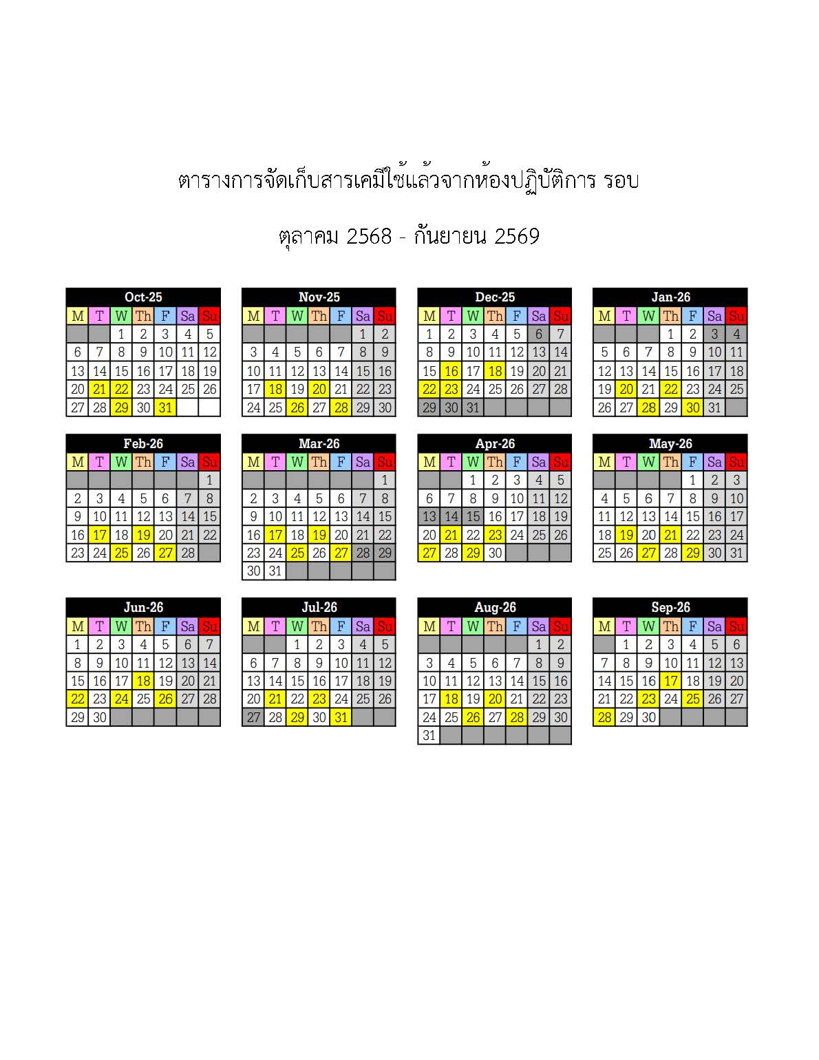 ตารางการจัดเก็บสารเคมีใช้แล้วจากห้องปฏิบัติการ รอบเดือน ตุลาคม 2568 - กันยายน 2569