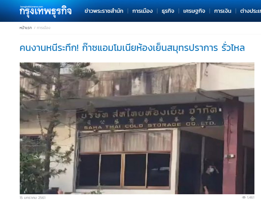 ในประเทศไทย เกิดอุบัติเหตุแก๊สแอมโมเนียรั่วไหลในโรงงานอยู่บ่อยครั้ง ดังเช่นเหตุการณ์ ก๊าซแอมโมเนียห้องเย็นแช่แข็งอาหารทะเล สมุทรปราการ ทำให้คนงาน และชาวบ้านในบริเวณนั้นมีอาการแสบคอ แสบตา และอาเจียน รวมทั้งสัตว์เลี้ยงที่สูดดมแก๊สแอมโมเนียเสียชีวิตจำนวนหนึ่ง ซึ่งเจ้าที่ดับเพลิงสามารถควบคุมเหตุการณ์ไว้ได้ โดยปิดวาล์วแก๊ส และฉีดพ่นน้ำเพื่อสลายแก๊สแอมโมเนีย